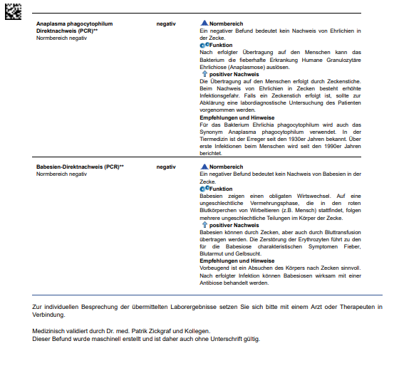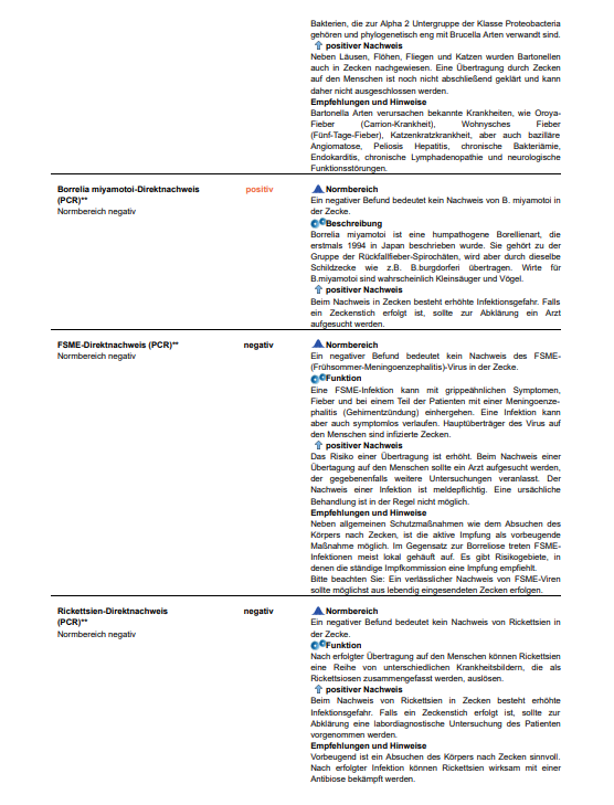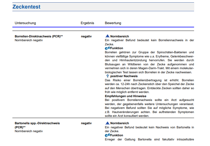 تحليل القراد في تلك القطعة سوف يمنحك وضوحًا بشأن ما إذا كنت مصابًا أم لا. يمكن تقييم هذا الخطر مبكرًا ويمكن تفسير أي أعراض بشكل أكثر موثوقية. ومن خلال هذه المعرفة، يمكنك بعد ذلك التفكير في خيارات العلاج المناسبة الأخرى. يجب دائمًا مناقشة التدابير التشخيصية مع الطبيب أو المعالج.